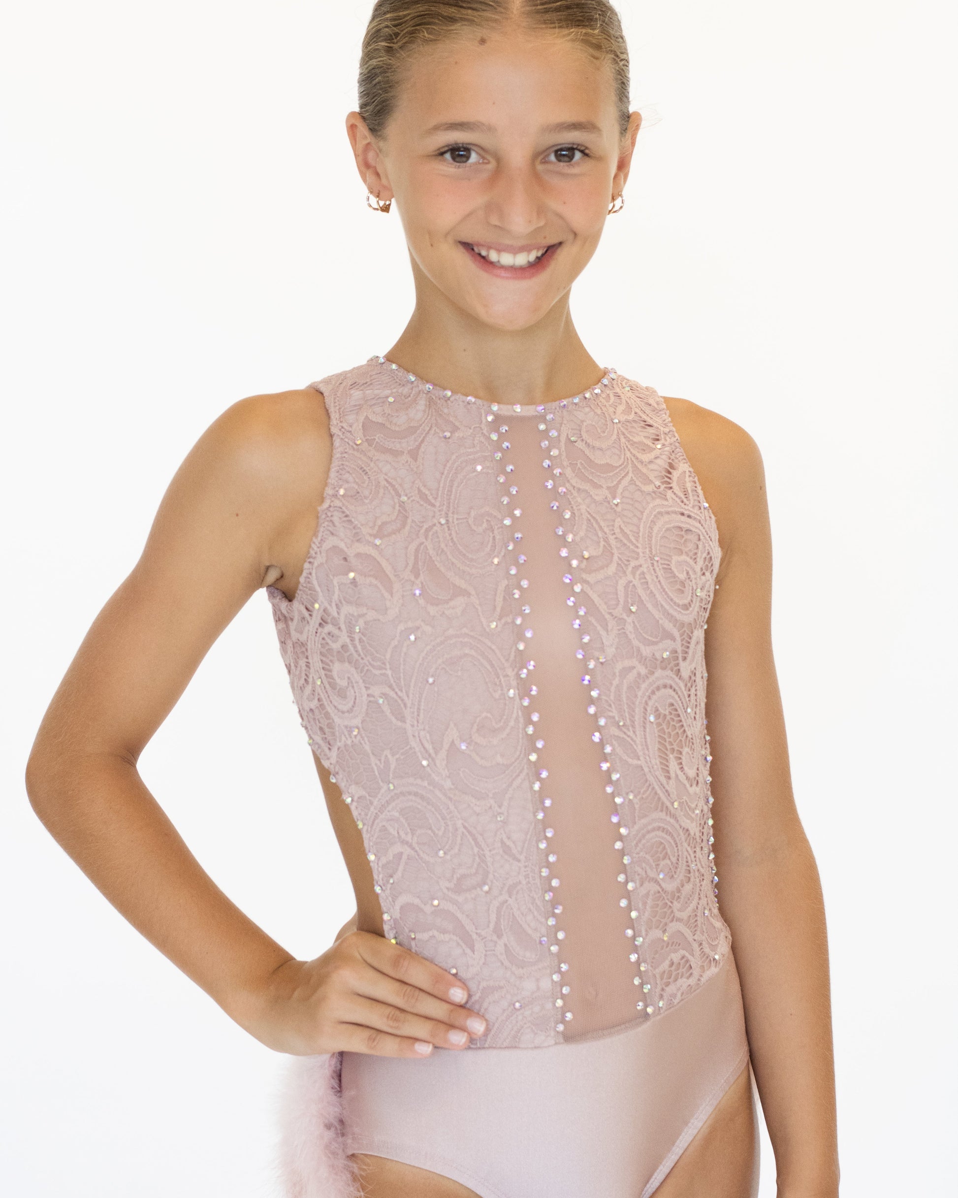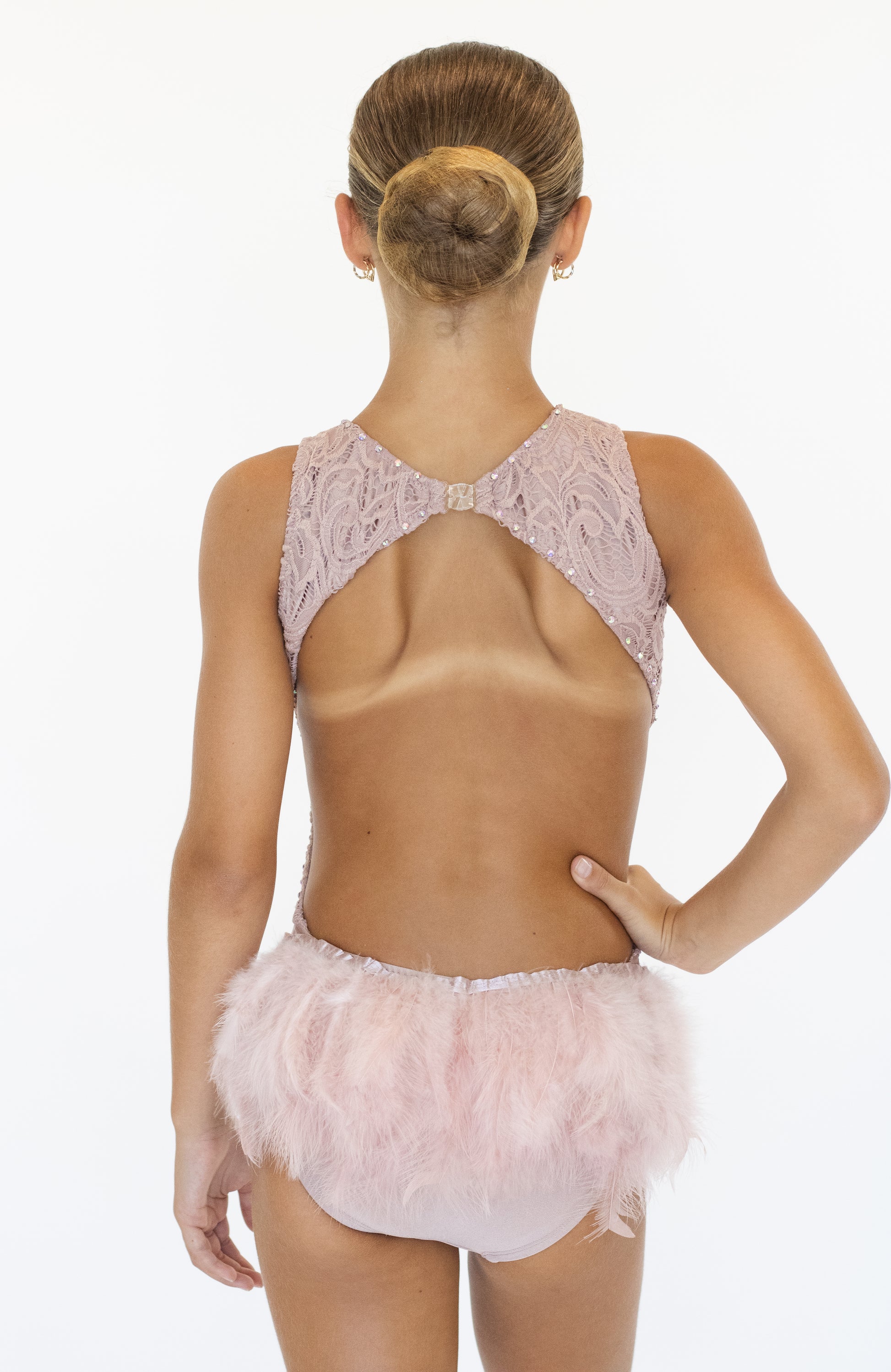 Shine in our Broadway Baby costume. Featuring feather trim, crystal embellishments, and a mesh centre panel, this stunning costume is perfect for your Broadway Jazz or Tap routine.
