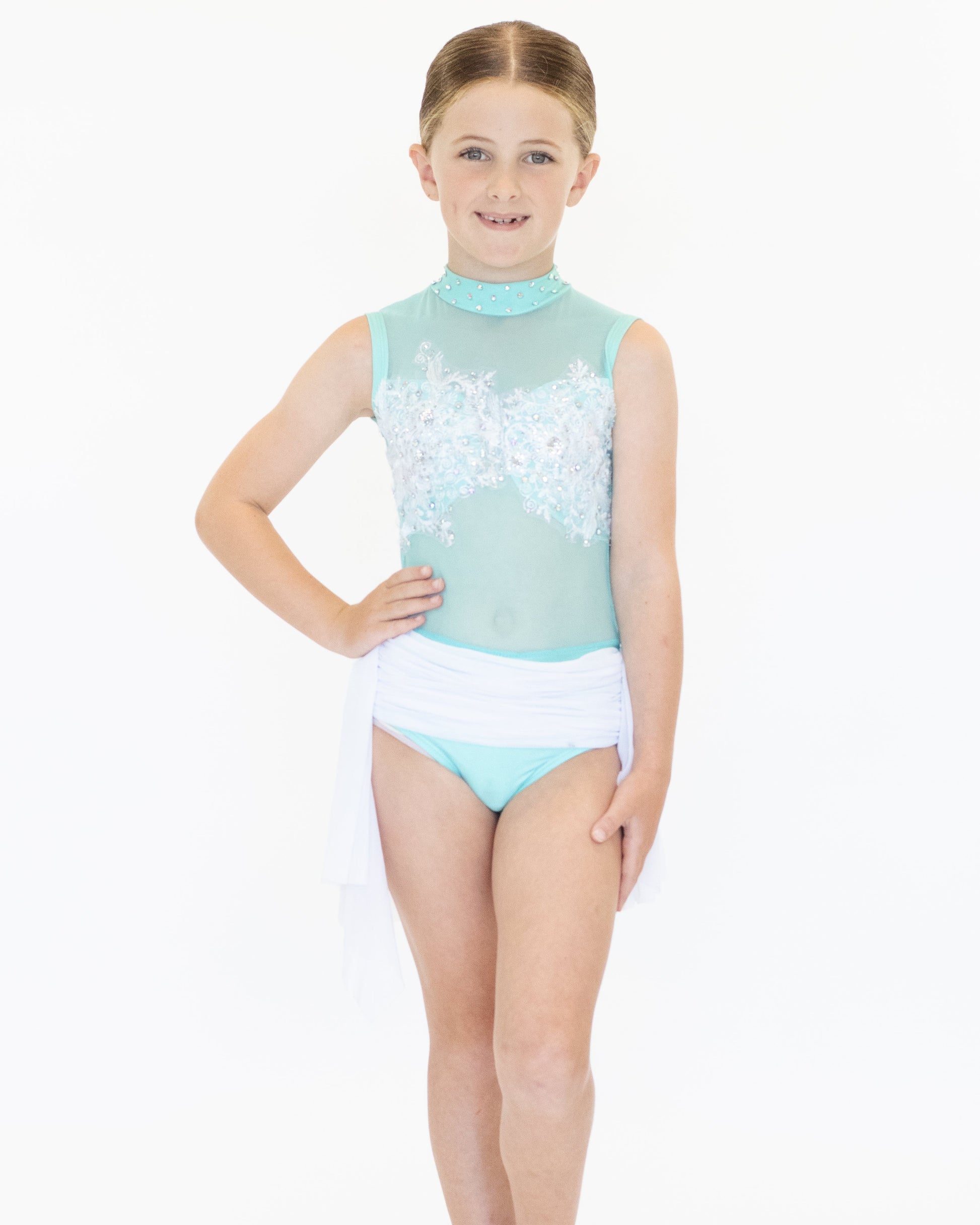 Fresh and graceful, this aqua lyrical costume features a soft aqua base with a high neckline and sheer mesh panelling, creating a clean and delicate silhouette on stage. Intricate white floral appliqué and subtle crystal rhinestones add refined detail, while a flowing white chiffon waist drape enhances movement and line.