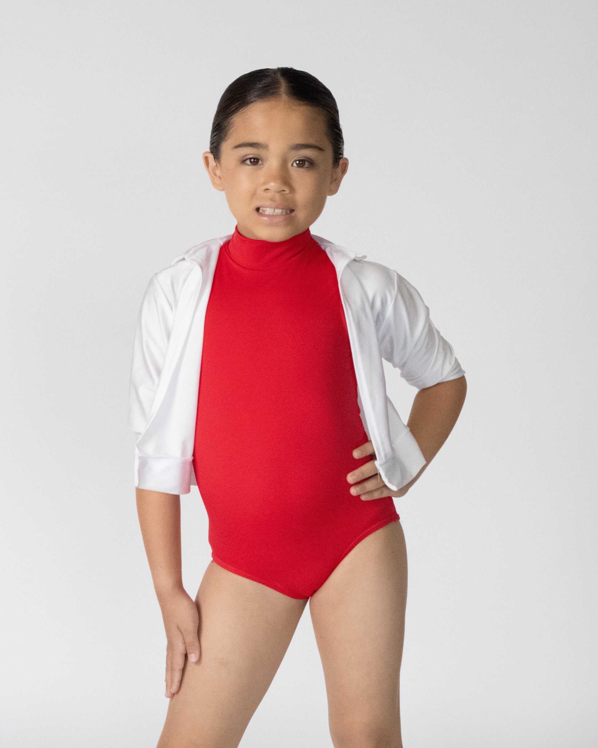 Bold, classic and full of stage presence! This striking red high-neck leotard delivers clean lines and confident energy, perfectly paired with a crisp white cropped jacket for that sharp, performance-ready finish.