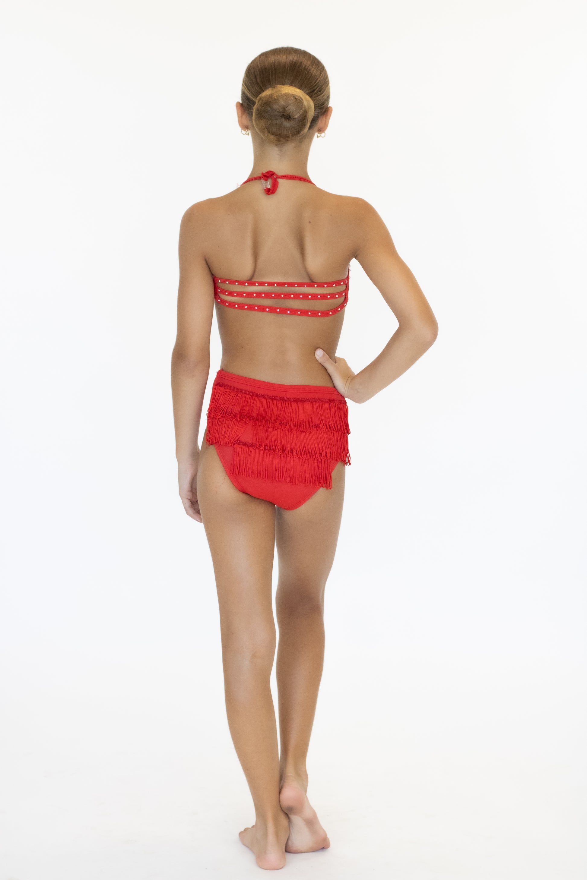 Fierce, fiery and made to command attention! This striking red costume features a halter neckline with sparkling rhinestone detailing and bold curved cut-outs that create a sleek, sculpted silhouette on stage.