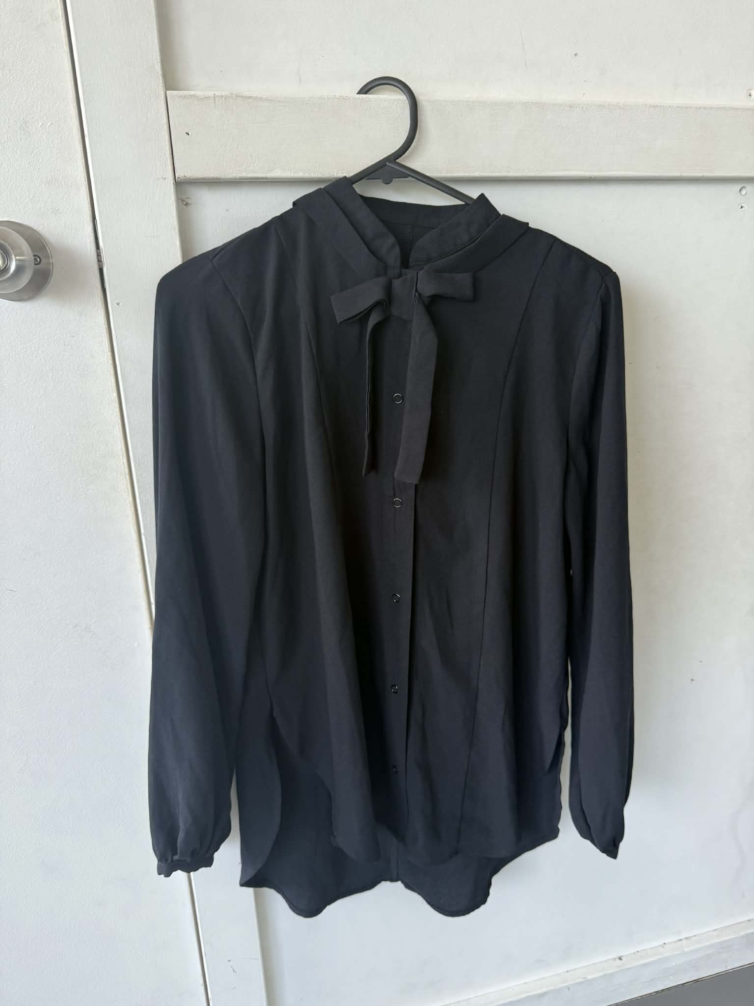 A sleek and versatile black button-up shirt featuring long sleeves, cuffed wrists, and a stylish necktie bow detail. This lightweight top offers a flattering fit with a slightly longer back hem, making it ideal for contemporary routines. An easy base piece for costuming, this shirt provides comfort, class, and effortless style.