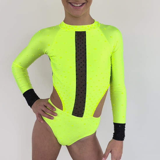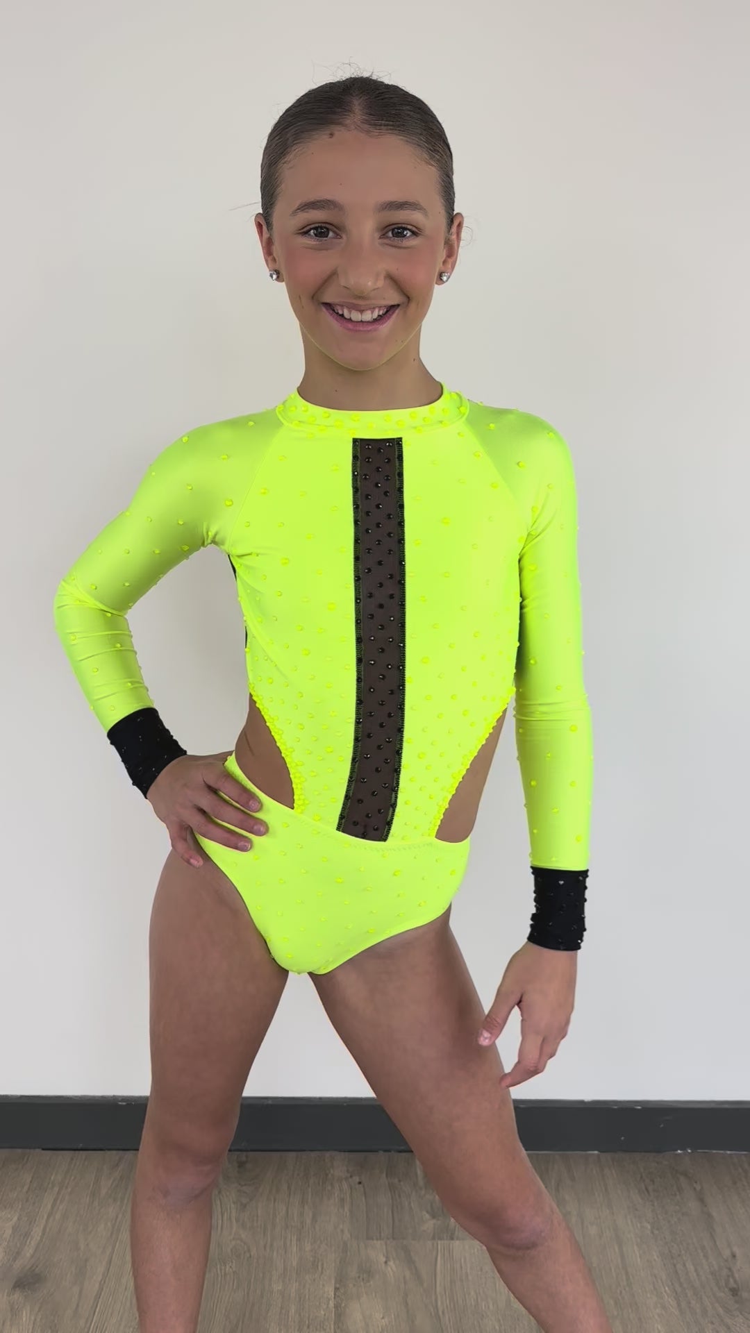 Bring the energy with this bold and modern neon yellow solo costume. Featuring cutouts, sleek black mesh panelling, and a pop of sparkle with black rhinestone cuffs, this edgy design is perfect for jazz or commercial numbers. The high-impact color and clean silhouette demand attention and move effortlessly with the dancer.