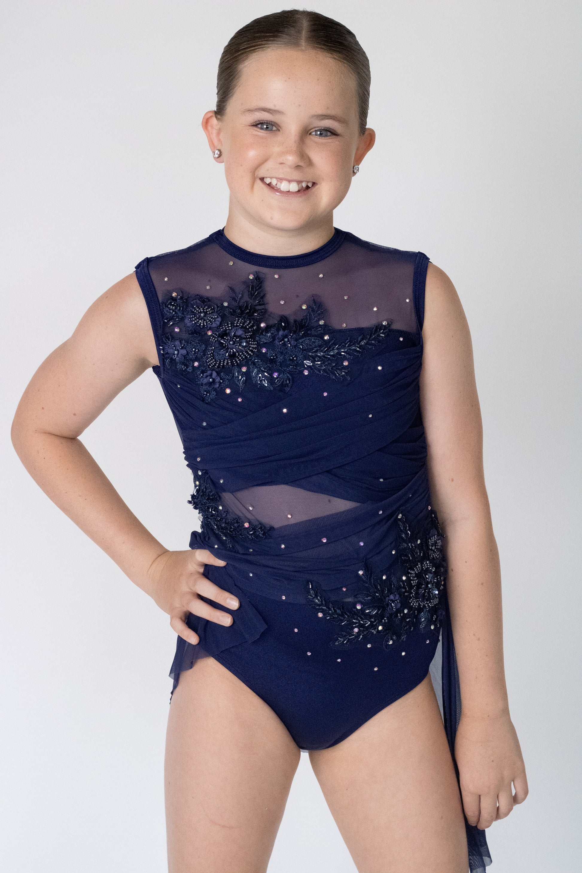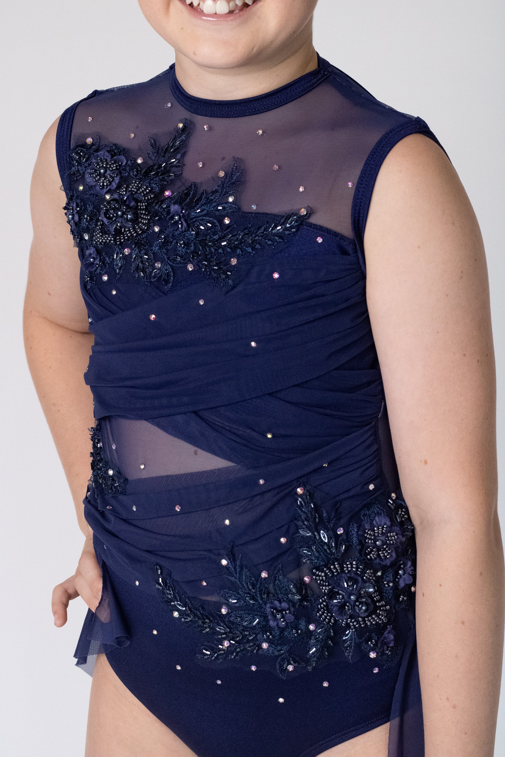 Elegant and expressive, this navy lyrical costume features a rich navy base with sheer mesh panelling and softly draped detailing that creates depth and fluidity on stage. Delicate floral appliqué and scattered rhinestones add subtle sparkle, while the asymmetric chiffon drape enhances movement and line throughout the performance.