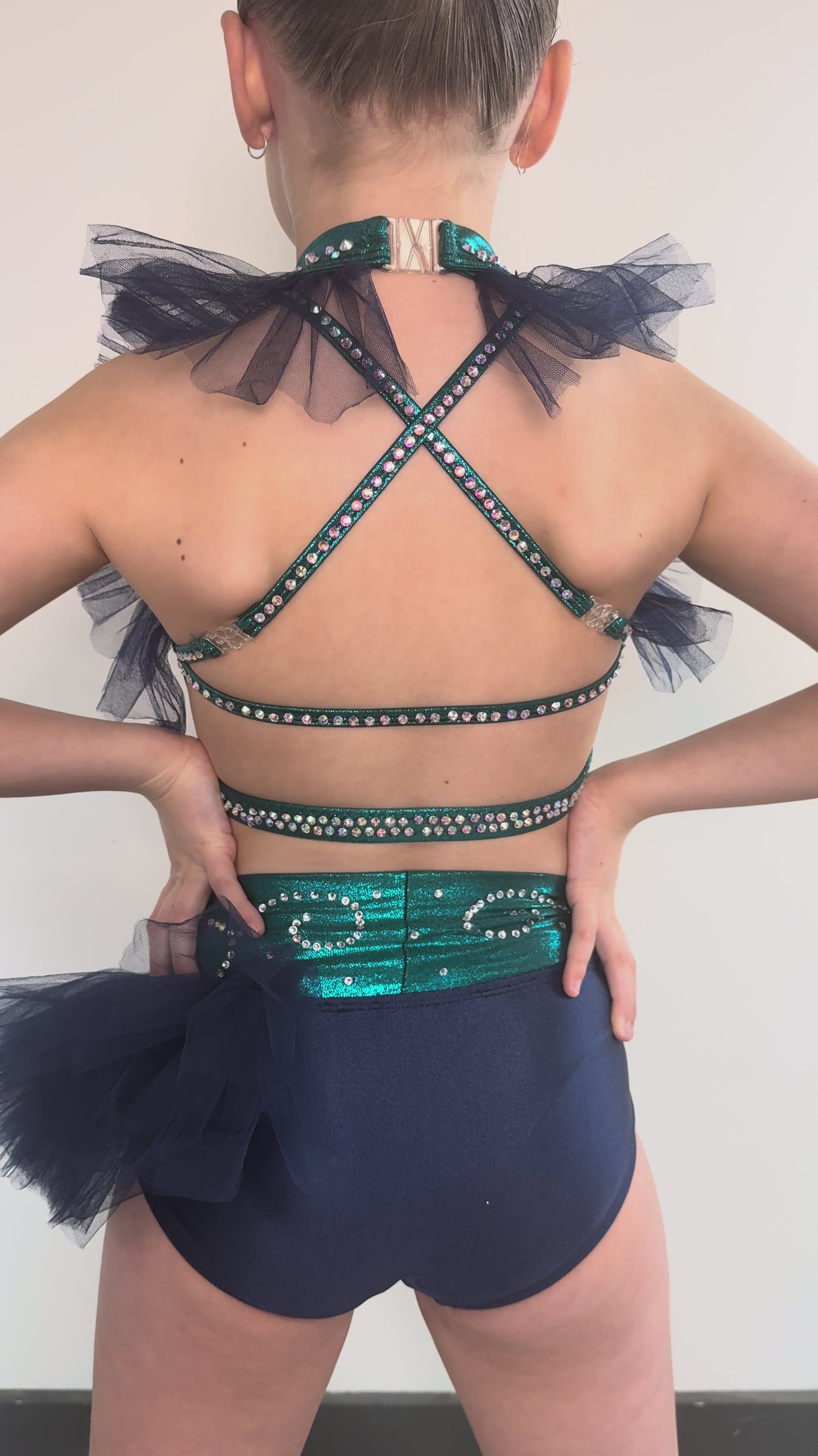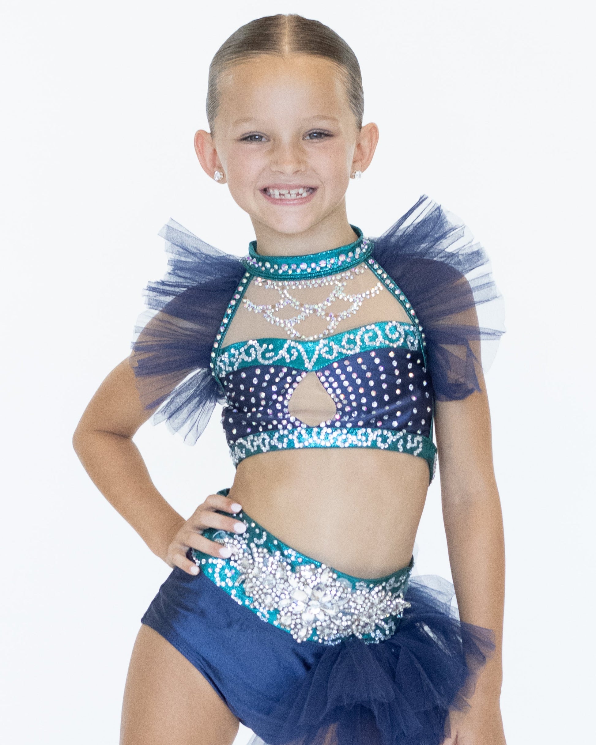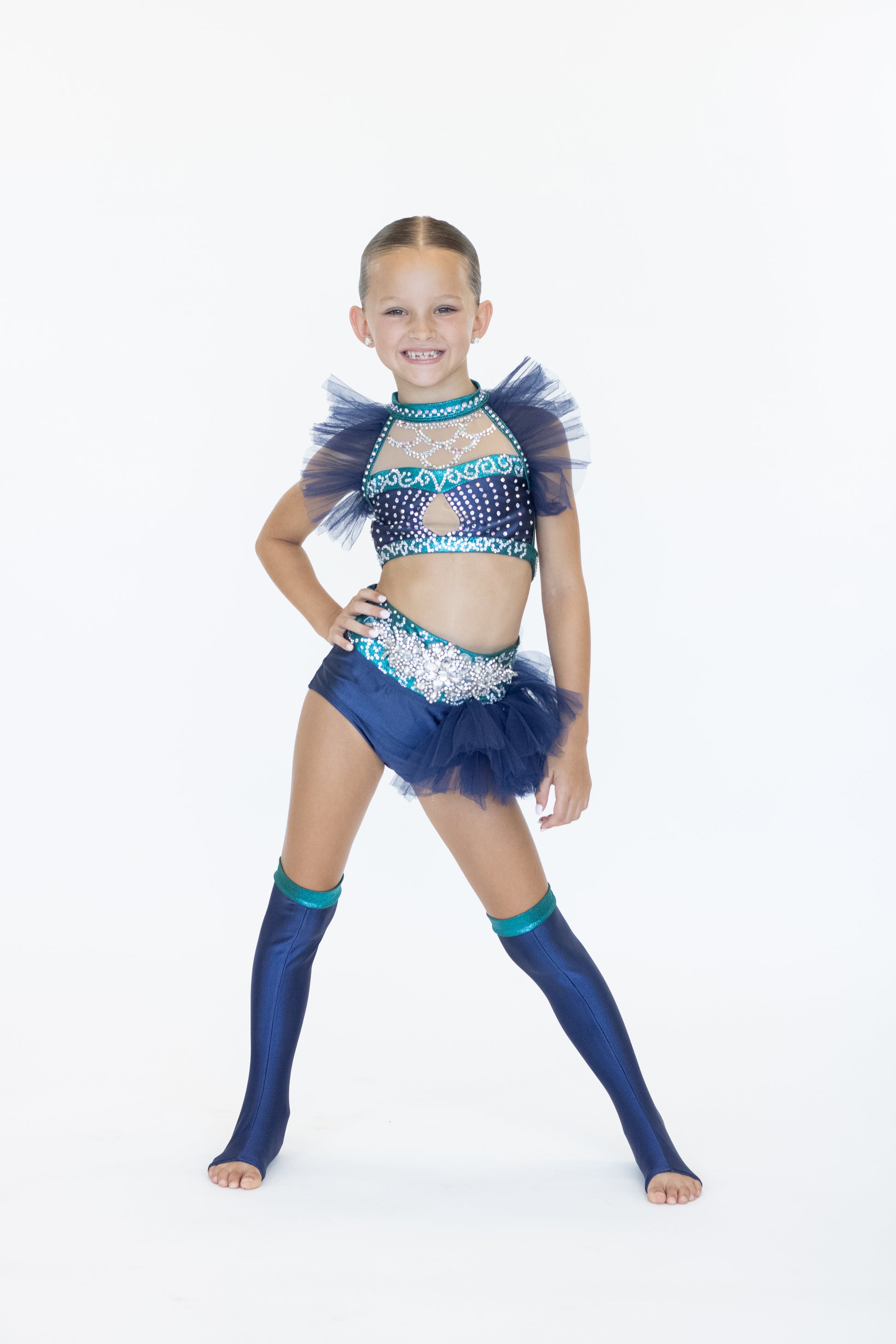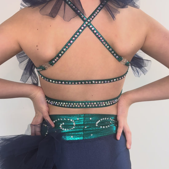 Bright, bold, and full of personality — this costume is made to shine! This eye-catching navy and teal set features a high-neck crop with rhinestone detailing, mesh panelling, and playful tulle accents. The matching briefs are adorned with a statement rhinestone appliqué and layered tulle for extra flair. Complete with matching spats, this look is sure to stand out.