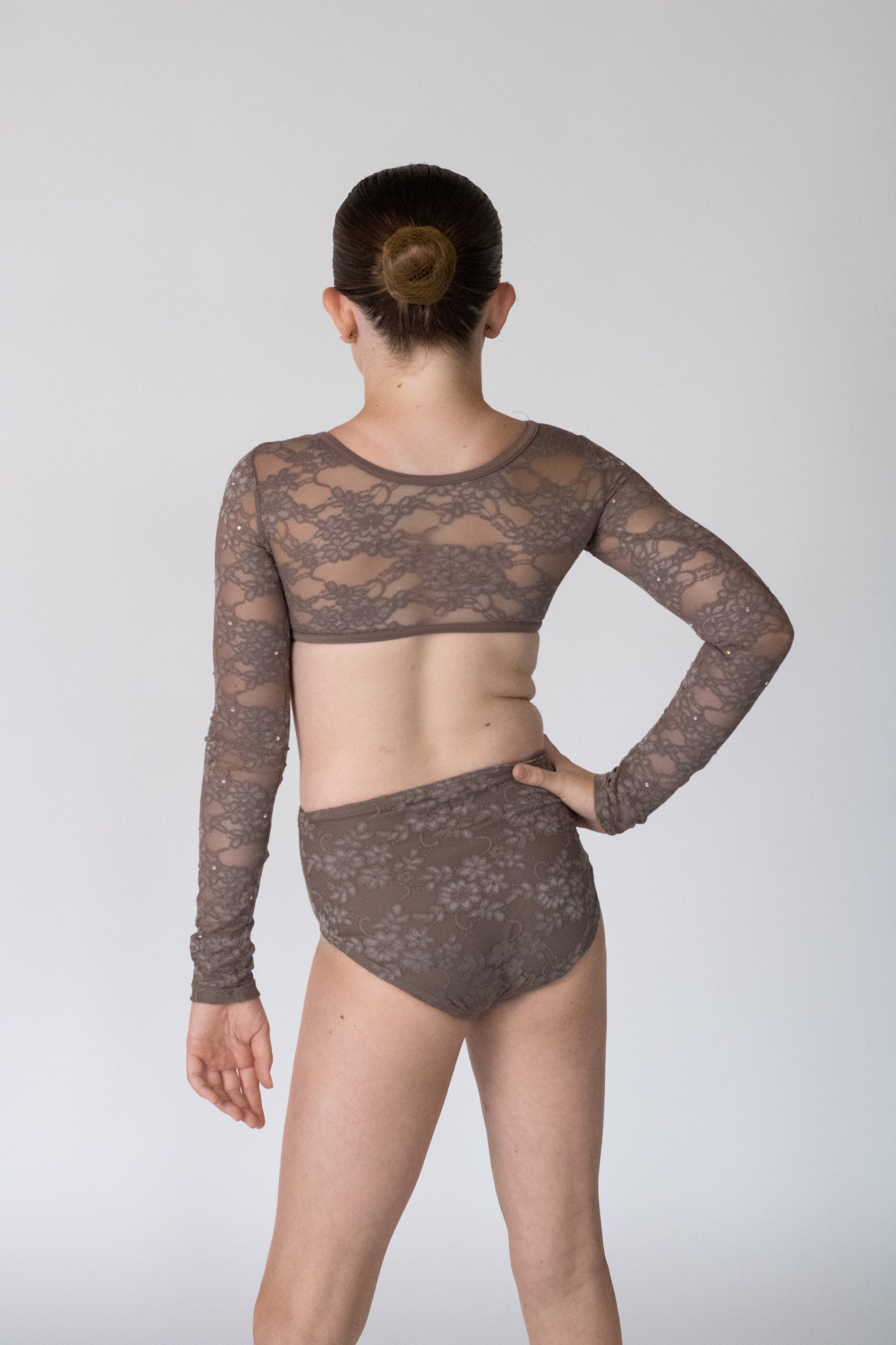 Elegant and timeless, this mocha lace contemporary costume is designed to create a soft yet powerful stage presence. Featuring a rich mocha base layered with intricate floral lace, this long-sleeve leotard offers beautiful texture and depth under stage lights. Subtle rhinestone detailing adds a gentle shimmer, while the side cut-outs enhance lines and create a refined, modern silhouette.